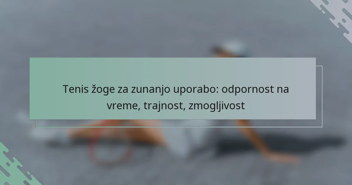 Tenis žoge, zasnovane za zunanjo uporabo, so posebej oblikovane za izboljšanje odpornosti na vreme, trajnosti in zmogljivosti, kar zagotavlja, da lahko prenesejo različne zunanje pogoje. Pravilna izbira tenis žog lahko znatno vpliva na igrivost, saj na dejavnike, kot sta odbijanje in kompresija, vpliva vreme. Blagovne znamke, kot so Wilson, Dunlop in Penn, so znane po svoji kakovosti, kar jih dela odlične možnosti za igralce, ki iščejo zanesljivo zmogljivost na zunanjih površinah.